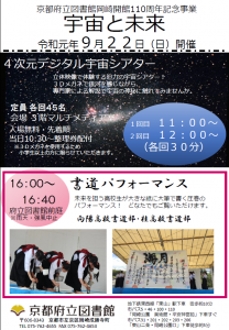 内容は「4次元デジタル宇宙シアター」と「書道パフォーマンス」の二本立て!ぜひ京都府立図書館にお越しください。