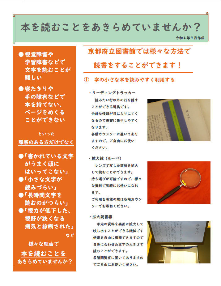 京都府立図書館では、図書館の利用に障害のある方を対象に、次のサービスを実施しています。利用は無料です。